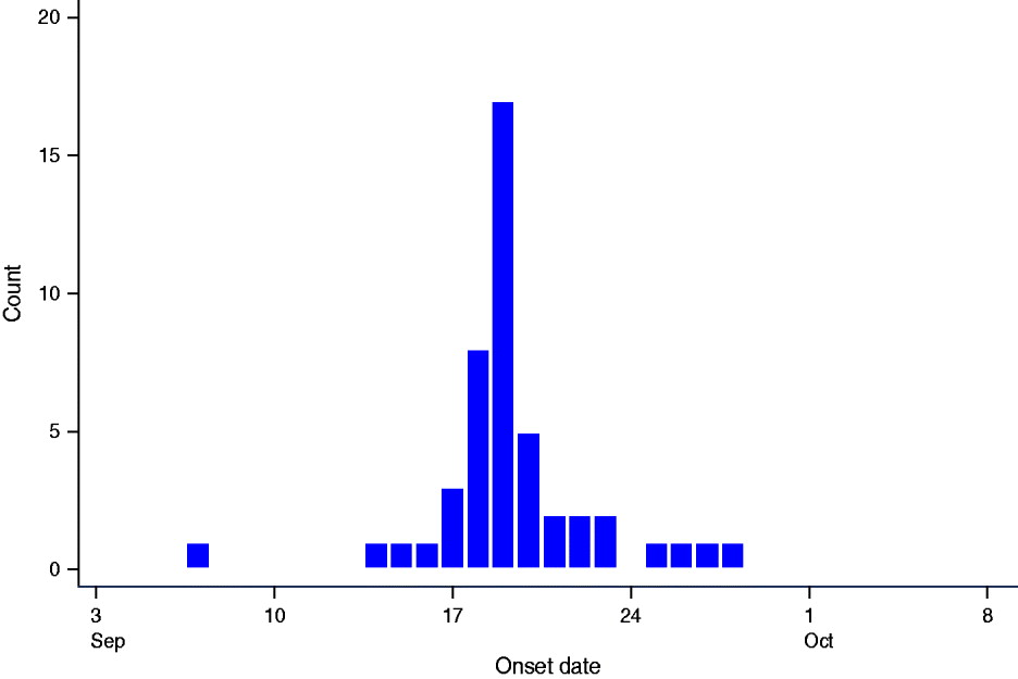 The epidemic curve illustrates a point-source outbreak (Fig. 1). Later cases may indicate secondary spread within families or schools. Case 1 is a potential source of the outbreak as he had the earliest onset of illness in this incident.