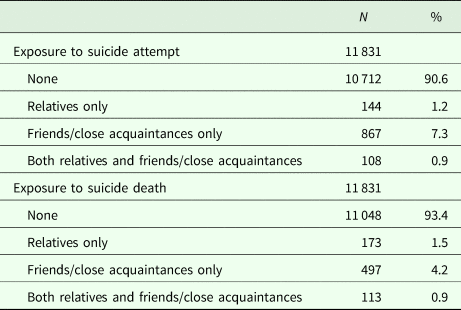 As shown in Table 2, of the 11 831 participants, 9.4% (n = 1119) reported having exposed to suicide attempt, including 1.2% (n = 144) having exposed to suicide attempt of relatives only, 7.3% (n = 867) having exposed to suicide attempt of friends/close acquaintances only and 0.9% (n = 108) having both relatives and friends/close acquaintances who had attempted suicide. A total of 6.6% (n = 783) participants reported having exposed to suicide death, including 1.5% (n = 173) having exposed to relatives’ death by suicide, 4.2% (n = 497) having exposed to friends/close acquaintances’ death by suicide and 0.9% (n = 113) having exposed to both relatives’ and friends/close acquaintances’ death by suicide.