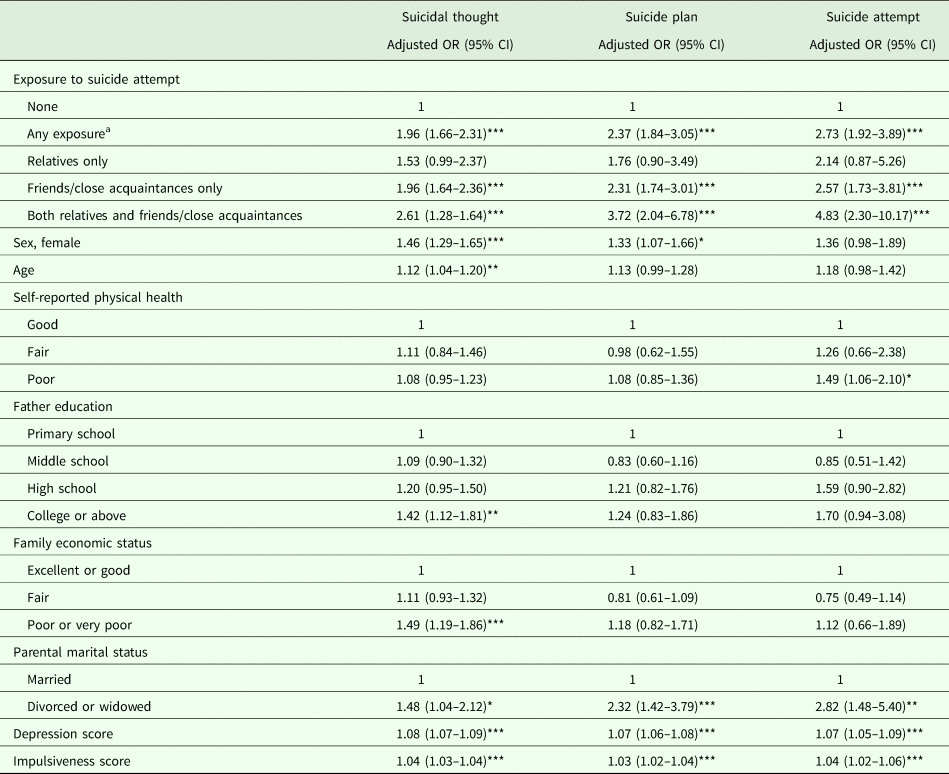 Table 3. Relationships between suicidal behaviours and exposure to suicide attempt by multiple logistic regression analyses