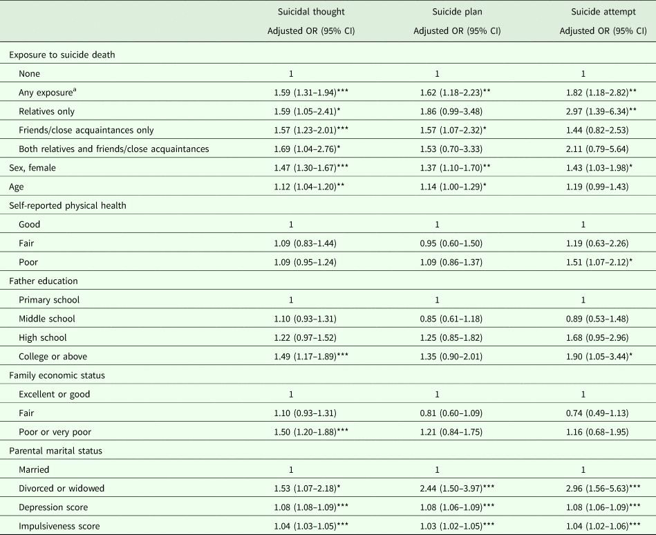 Fig. 2. Suicidal behaviours among Chinese adolescents exposed to suicide death. Note. aFisher's exact test; Note *p < 0.05; **p < 0.01; ***p < 0.001.