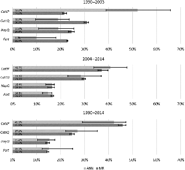 Figure 4. Comparison of variable impact analyses between artificial neural network (ANN) and multivariate regression (MR) methods: minimum, average, and maximum variable impacts as estimated across cycle or period are reflected in error bars using the same 10 different randomly selected training sets across method that varied in size from 60 to 80% in 5% increments.