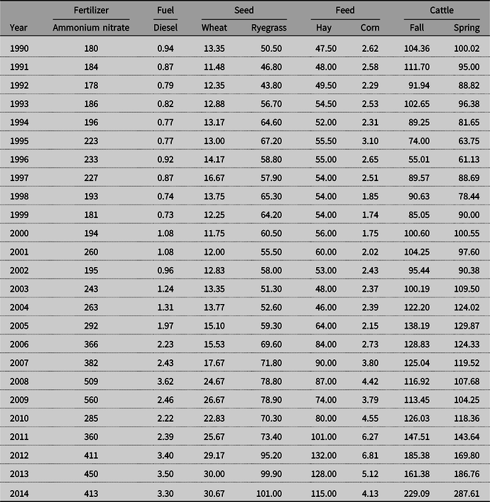 Table 2. Nominal Arkansas fertilizer, fuel, seed, and feed costs and cattle prices, 1990–2014