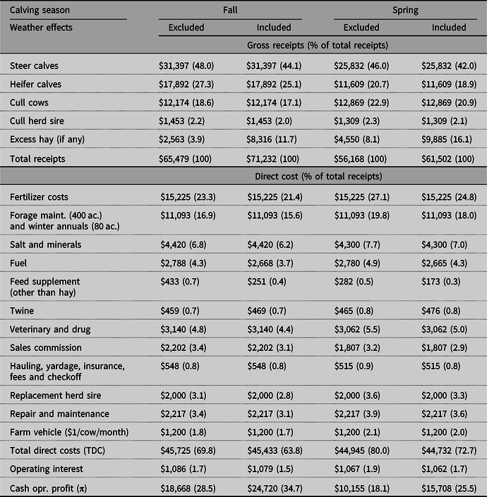 Table 3. Sample of estimated gross receipts and direct costs of a 100-cow herd by calving season using 2005–2014 average prices with and without weather effects using the least fertilizer
