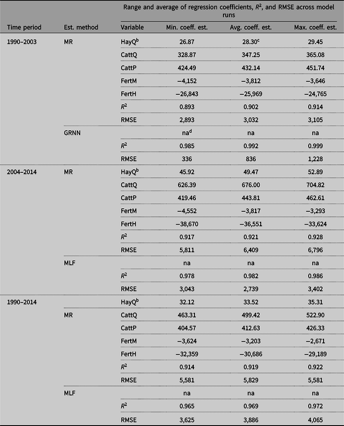 Table 4. Estimated effects of hay production, cattle sales, and fertilizer use on annual estimates of cow-calf cash operating profits using multivariate regression (MR) and comparison of R 2 and RMSE on testing data between MR and artificial neural network techniques of generalized regression neural networks (GRNNs) for 1990–2003, multi-layer feed forward (MLF) neural networks with 5 nodes for 2004–2014 and 6 nodes for 1990–2014 across 10 randomly selected training setsa by time period