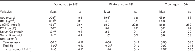 * For conversion of 25OHD from nmol/l to ng/ml, divide by 2·496; for conversion of PTH from pmol/l to pg/ml, multiply by 11·1. a P<0·05, b P<0·01, c P<0·001, as compared with the reference category older age group.