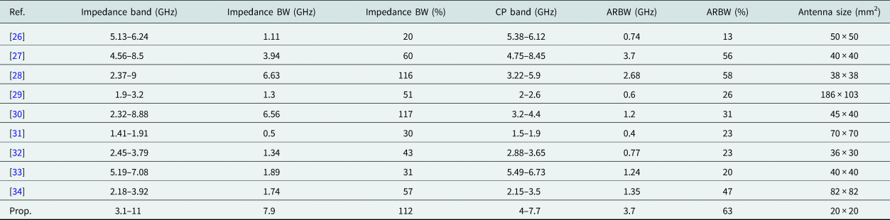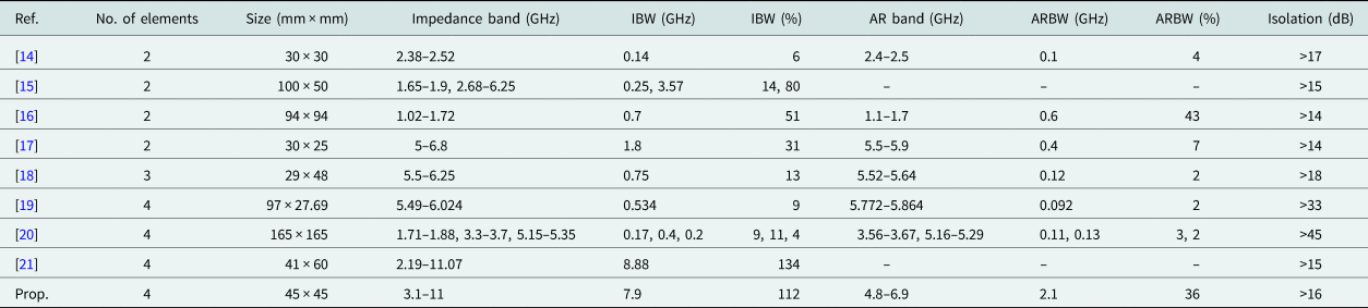 Table 2. Comparison of the proposed antenna element with other reported antennas