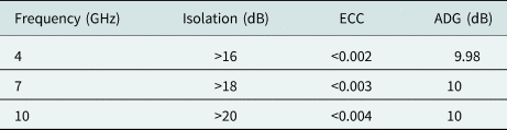 Further, the apparent diversity gain (ADG), which implies the increment in the quality of a signal owing to the introduction of diversity scheme in the MIMO systems, is also calculated [Reference Chandel, Gautam and Rambabu37]. For the proposed four-port MIMO antenna, the performance parameters at frequencies 4, 7, and 10 GHz are presented in Table 3, and it is observed that the value of ADG is more than 9.9 dB.