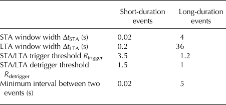 Table 1. Parameters for seismic event identification for the STA/LTA method
