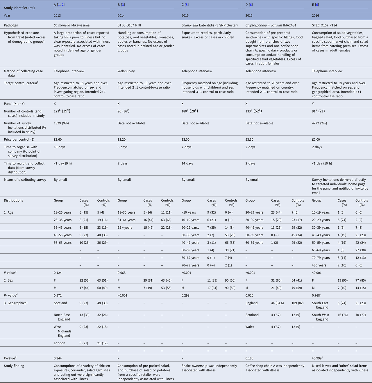 Between 2013 and 2016, market research panel control groups were used in five investigations of diverse national outbreaks of gastrointestinal pathogens after observed increases in cases of: (study A) Salmonella Mikawasima with no clear excess among defined age or gender groups and no hypothesised exposures associated with illness identified from trawling questionnaires [Reference Freeman2]; (study B) Shiga toxin-producing Escherichia coli (STEC) O157 with no clear excess among defined age or gender groups and handling or consumption of potatoes, root vegetables, tomatoes, apples or bananas identified as hypothesised exposures associated with illness [Reference Sinclair3]; (study C) Salmonella Enteritidis 5 single nucleotide polymorphism (SNP) single linkage cluster (methods for defining SNP profiles have been described previously [Reference Ashton4]) with an excess observed among children and exposure to reptiles, particularly snakes, identified as hypothesised exposures associated with illness [Reference Kanagarajah5]; (study D) Cryptosporidium parvum IIdA24G1 with an excess observed among adult females and consumption of pre-prepared sandwiches with specific fillings, food bought from branches of two supermarkets and one coffee shop chain, specific dairy products or consumption and/or handling of specified salad vegetables identified as hypothesised exposures associated with illness [Reference Gobin6]; and (study E) STEC O157 PT34 with an excess observed among adult females and consumption of salad vegetables, bagged salad, food purchased from a specific supermarket chain and salad items from catering premises identified as hypothesised exposures associated with illness [Reference Gobin6] (Table 1).