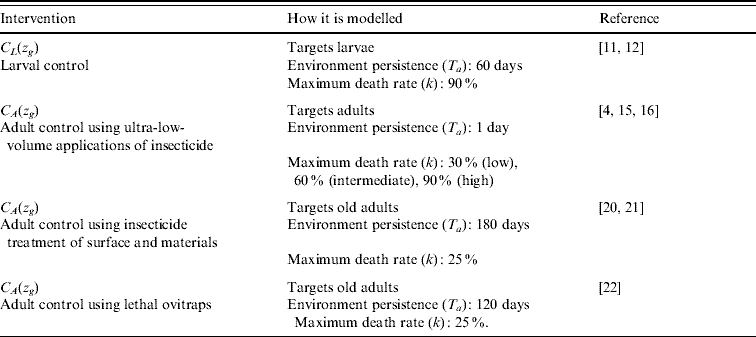 We evaluated four forms of vector control: (1) larval control [Reference Pontes12, Reference Lima, Melo and Valle43], (2) adult control using ultra-low-volume insecticide applications [Reference Koenraadt15, Reference Perich16], (3) adult control using insecticide treatment of surfaces and materials [Reference Kroeger20, Reference Ritchie21], and (4) adult control using lethal ovitraps [Reference Perich22] (Table 2). Interventions are simulated by applying an additional death rate to the affected compartment. The temporal decay in efficiency of an insecticide application (i.e. environmental persistence) is modelled by defining these additional death rates as functions of time (see Appendix for functions). Larval control poses a 90% risk of death on day 1 which decays to 0% over a 60-day period. Thus, evaluated interventions ranged from 1–6 larval applications annually. Adult control using ultra-low-volume insecticide applications poses a varying maximum risk of death of 30% (low efficacy), 60% (intermediate efficacy), and 90% (high efficacy) that occurs immediately after insecticide application and decays to 0% within the same day [Reference Gratz4, Reference Dorta14Reference Perich16]. Adult control using ultra-low-volume insecticide applications are carried out during the dengue season: evaluated interventions ranged from 1–12 applications per dengue season. Adult control using insecticide treatment of surfaces and materials persists in the environment for 180 days, allowing for two timetables: year-long continuous application or one application at the beginning of the dengue season. Adult control using lethal ovitraps persists in the environment for 120 days, and therefore either one, two, or three applications annually were evaluated.
