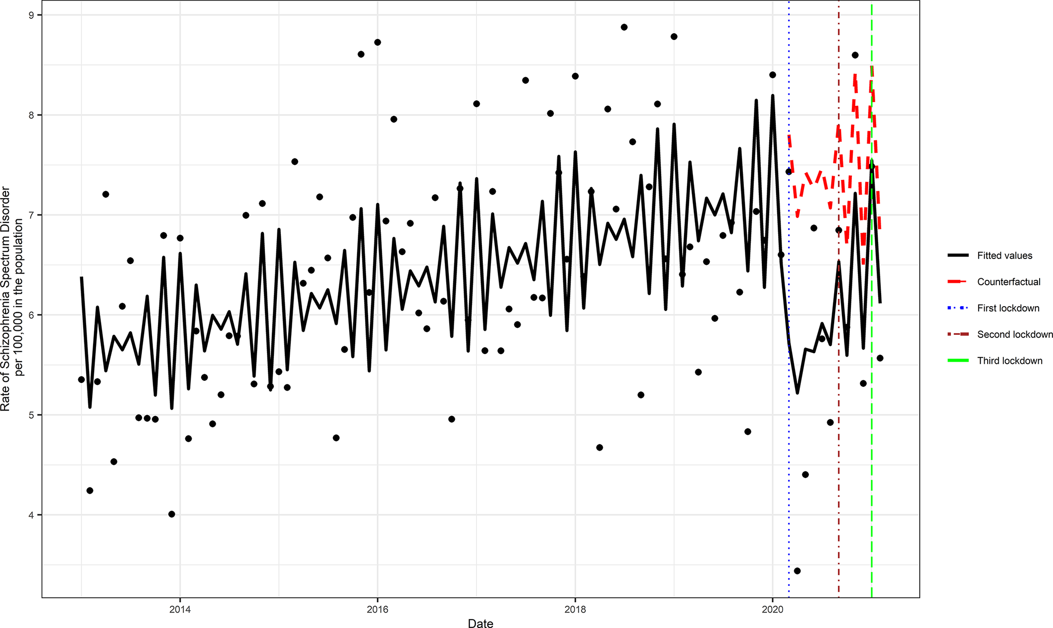 To date, four studies have examined the effect of the COVID-19 pandemic on schizophrenia. In the Rhineland region of Germany, based on inpatient service utilization for a range of psychiatric disorders during the first 3 months of the pandemic, results suggested reduced service utilization across all disorders, which was less pronounced for schizophrenia but increased in presentations with atypical psychotic features [Reference Zielasek, Vrinssen and Gouzoulis-Mayfrank25]. Similarly, based on electronic medical records during the first home-confinement period in the UK, a significant reduction in all mental health-related primary and secondary care contacts, including psychosis, was observed [Reference Mansfield, Mathur, Tazare, Henderson, Mulick and Carreira24]. In a survey of three European countries during confinement, daily fluctuations of brief psychotic-like experiences increased with associated country-specific COVID-19 deaths [Reference Simor, Polner, Bathori, Sifuentes-Ortega, Van Roy and Albajara Saenz23]. In China, outpatient registry data suggested that the period of COVID-19 was associated with an increased risk of schizophrenia compared to beforehand [Reference Hu, Su, Qiao, Zhu and YJPd26]. These early studies were undertaken early in the pandemic and so could not capture the protracted nature of the multiple biopsychosocial COVID-19 exposures (e.g., cumulative multiple stressors and infection). The studies lack information about incident cases and so we are unable to address whether the biopsychosocial exposures of the COVID-19 pandemic could trigger the onset of schizophrenia. Importantly, their approach did not enable inferences about evolving mental health needs that are critical for planning service provision.