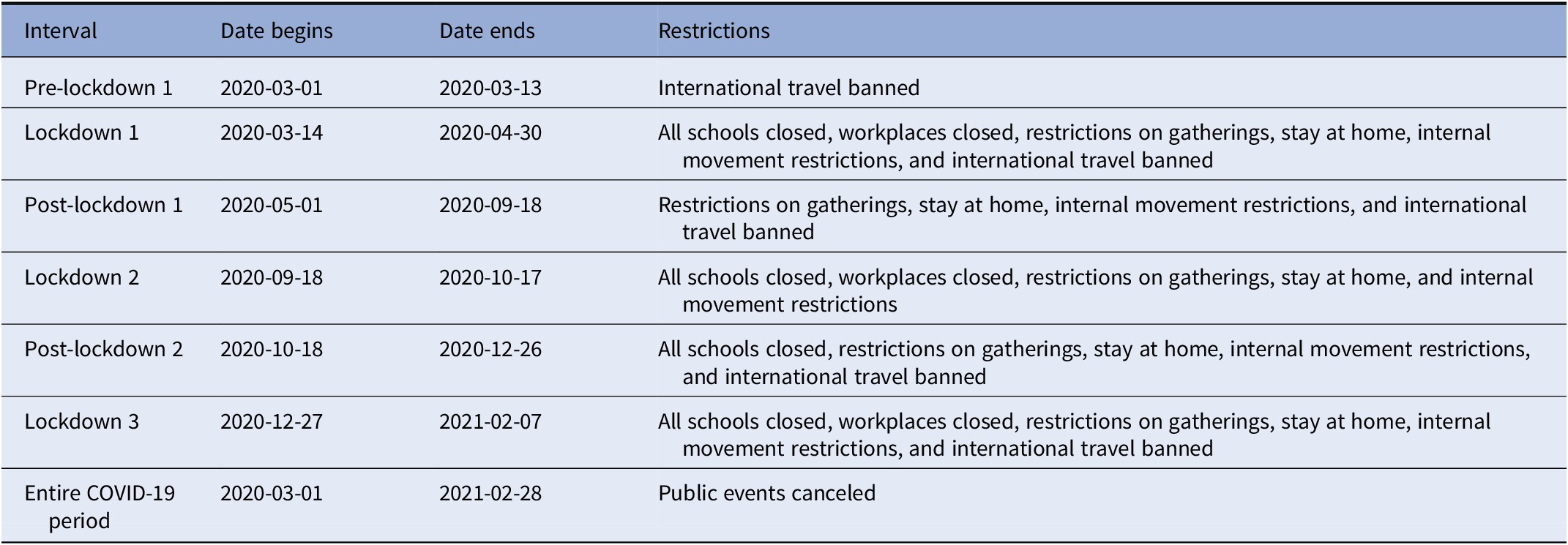 Note: All schools closed except nurseries. Workplaces closed for all but essential workplaces. Based on the Oxford COVID-19 Government Response Tracker [Reference Hale, Angrist, Goldszmidt, Kira, Petherick and Phillips30] for each interval and each restriction, we compared the mode value of the restriction to a threshold to classify whether the restriction occurred during the interval. For most restrictions, we used the Oxford COVID-19 Government Response Tracker threshold value of two, whereas for international travel ban, restrictions on gatherings and workplaces closed, we used a threshold value of three.