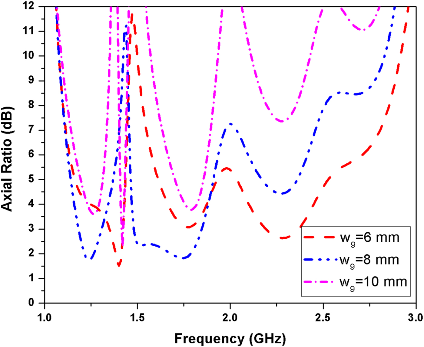 Fig. 10. Simulated axial ratio with different values of w 9.