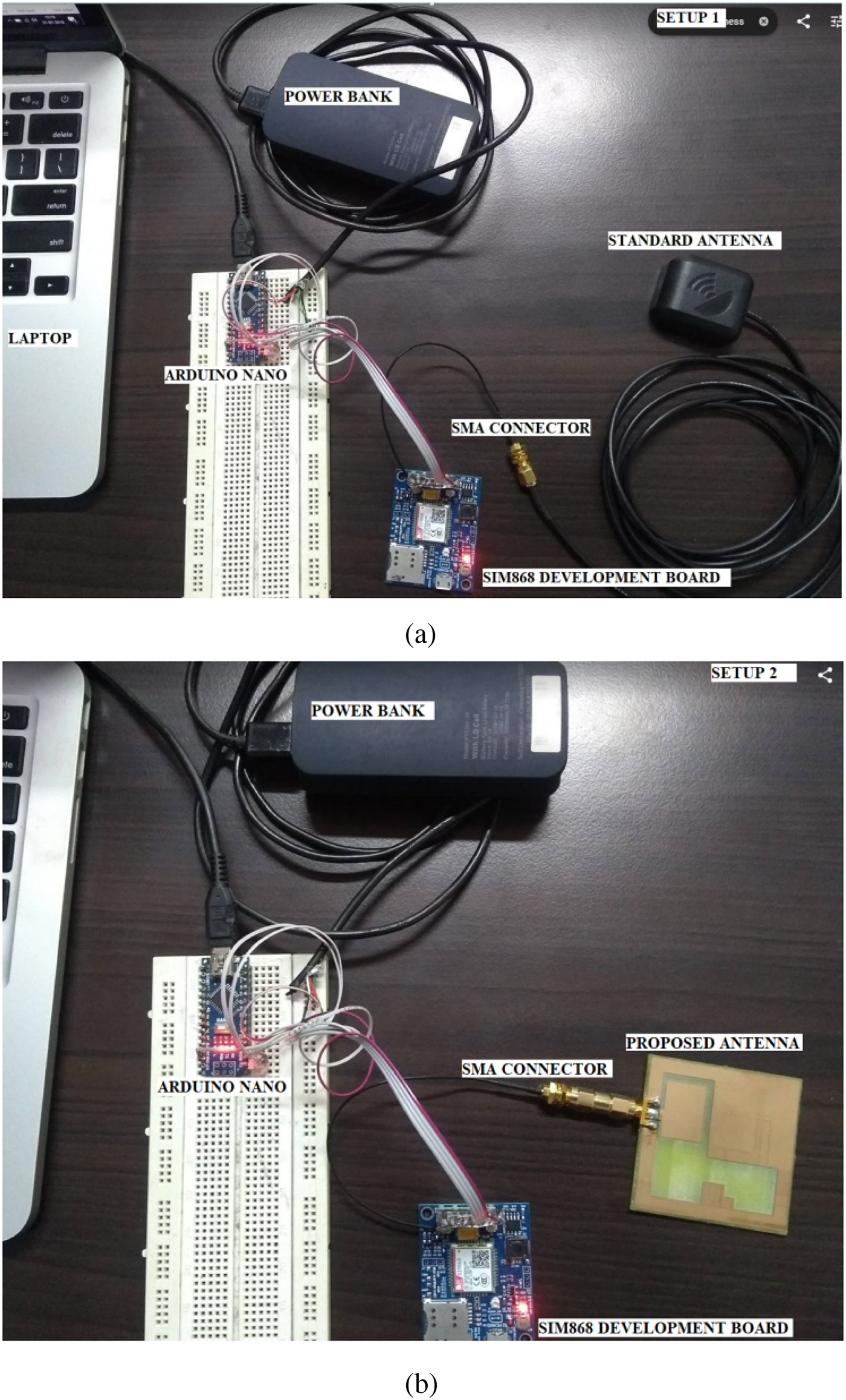 In this section, the proposed antenna is integrated with a commercially available GPS receiver and tested in the real environment. For the testing purpose, the SIM868 development board GSM/GPRS/Bluetooth/GPS module with two antennas is used (https://www.banggood.com/SIM868-Development-Board-GSM-GPRS-Bluetooth-GPS-Module-With-Two-Antenna-p-1159415.html). The module SIM868 supports both GSM/GPRS and GNSS technology intended for satellite navigation (http://simcomm2m.com/En/module/detail.aspx?id=145). The module has two antenna interfaces, one for GSM and other for GPS, and to uphold simplicity in this study, only one antenna port (GPS port) has been used. Figure 11 shows the experimental setup of SIM868 development board which is serially connected to the Arduino nano microcontroller based on ATmega328P (https://store.arduino.cc/usa/arduino-nano). This helps in sending various AT commands to SIM868 module; by means of these AT commands, one can easily control the functioning of this module. Figure 11(a) represents the complete setup which is made to receive GPS signals at L1 band by means of a standard antenna. As can be seen in Fig. 11(a), the available standard antenna is connected with the SIM868 development board through an SMA connector. The white cable establishes a serial connection between the Arduino nano microcontroller and SIM868 module for the transmission and reception of information. A power bank with a rating of 5 V/1 A is used for providing power to both the modules. Once the setup is ready, the sequence of AT commands can be easily executed (for obtaining the GPS coordinates of any location) using the laptop which is connected to Arduino nano microcontroller through the USB port.