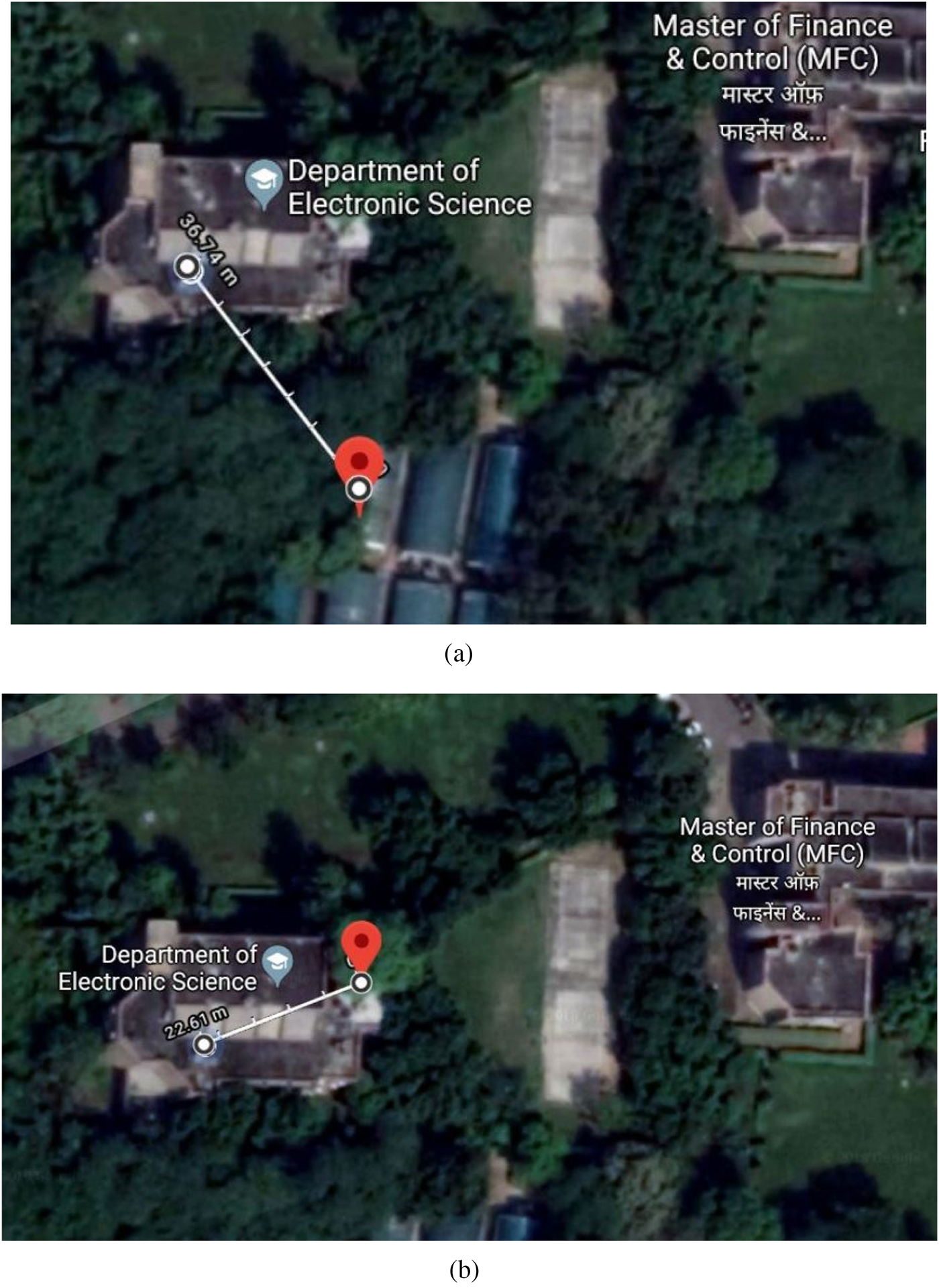 Fig. 12. Satellite view with calculated distance by Google maps: (a) commercially available antenna, (b) proposed antenna.