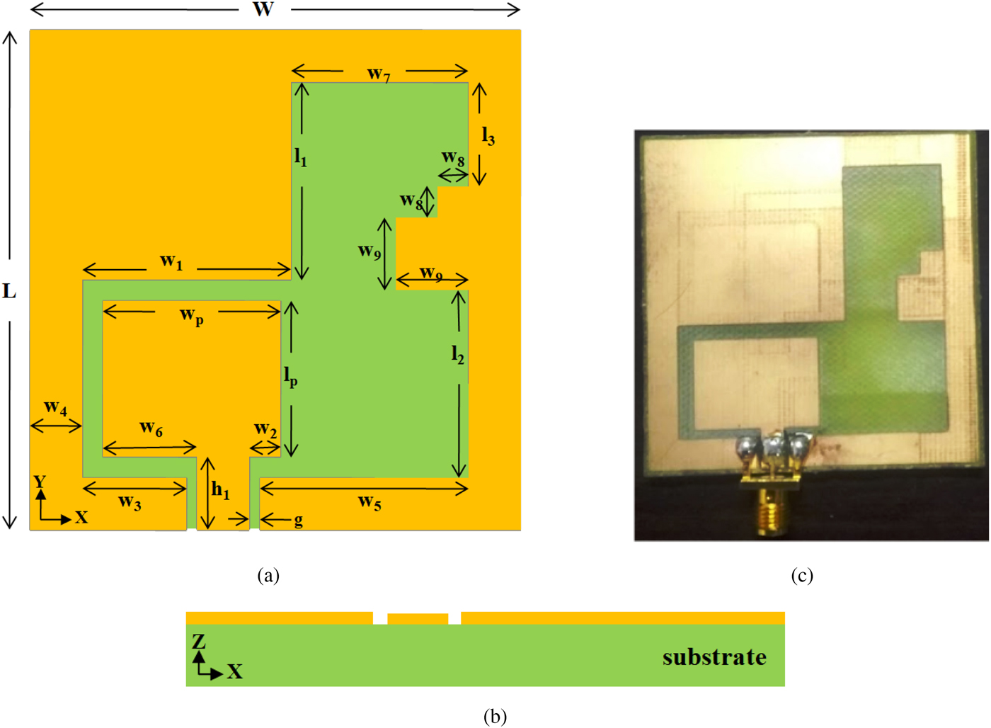 Fig. 1. Geometry of the proposed antenna: (a) top view, (b) side view, (c) fabricated prototype.