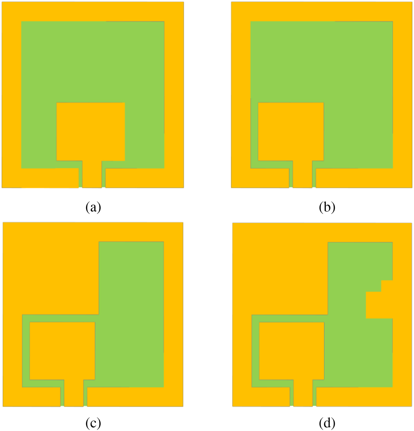 Fig. 2. Evolution steps of the proposed antenna: (a) Ant. 1, (b) Ant. 2, (c) Ant. 3, (d) Ant. 4.