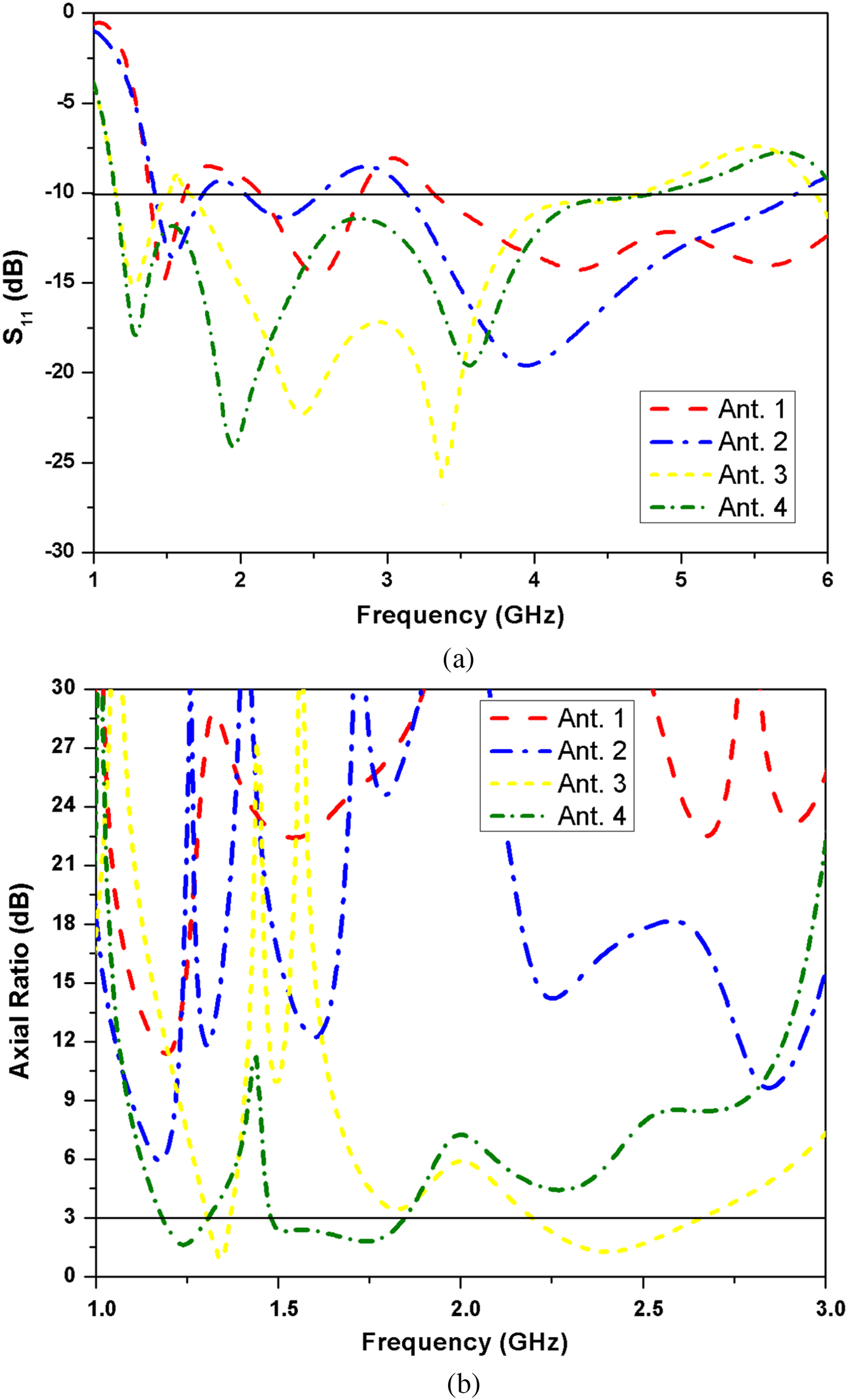 Fig. 3. Performance comparison of antenna designing steps: (a) magnitude of S 11, (b) axial ratio.
