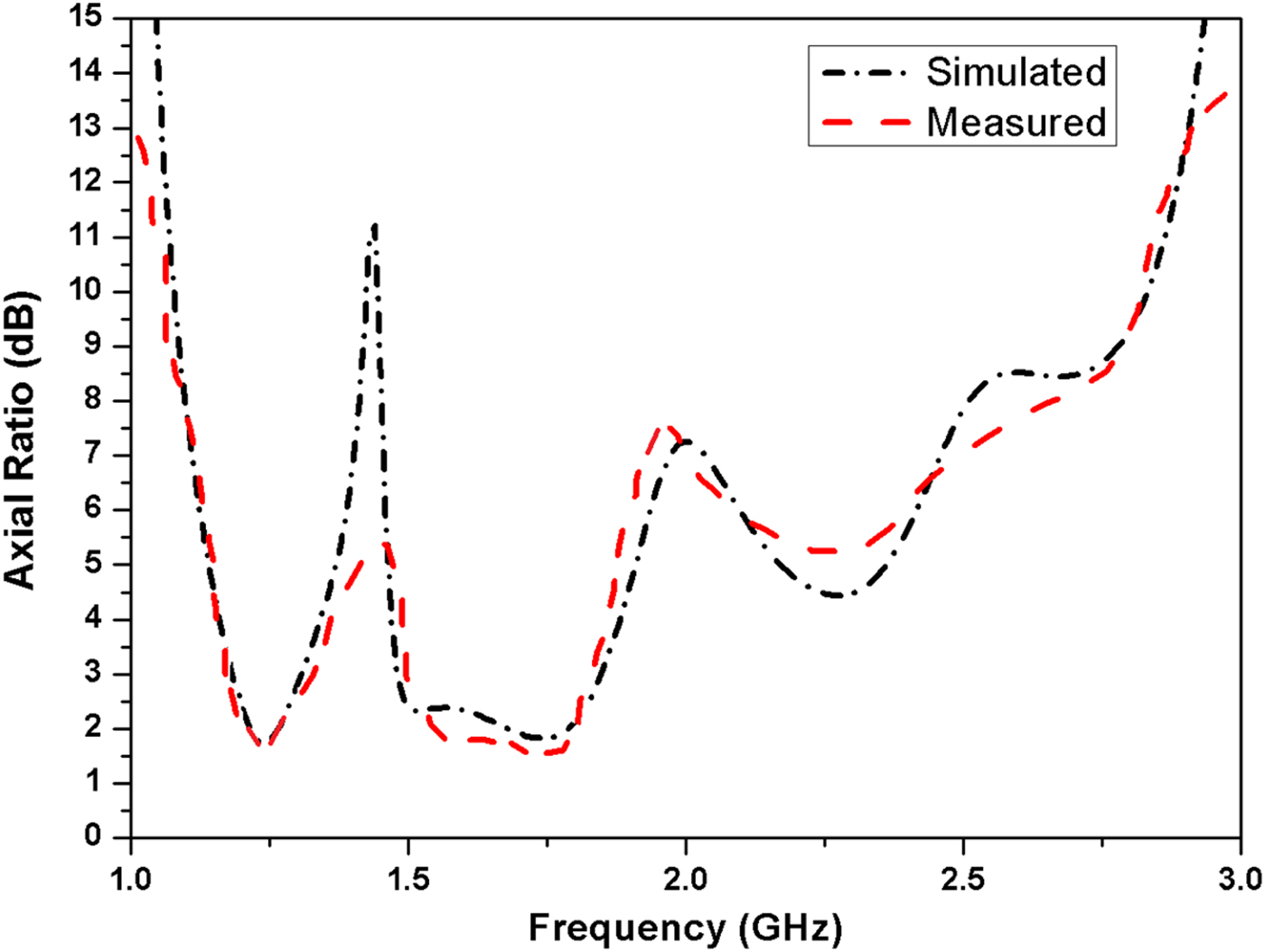 Fig. 5. Simulated and measured axial ratio of the proposed antenna.