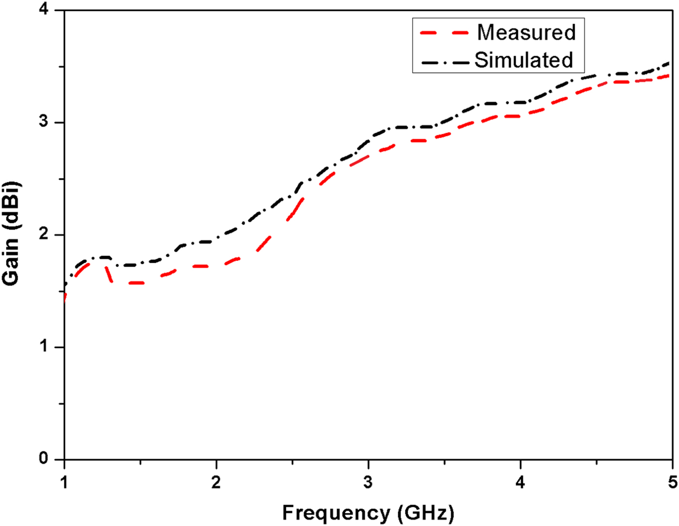 Fig. 6. Simulated and measured gain of the proposed antenna.
