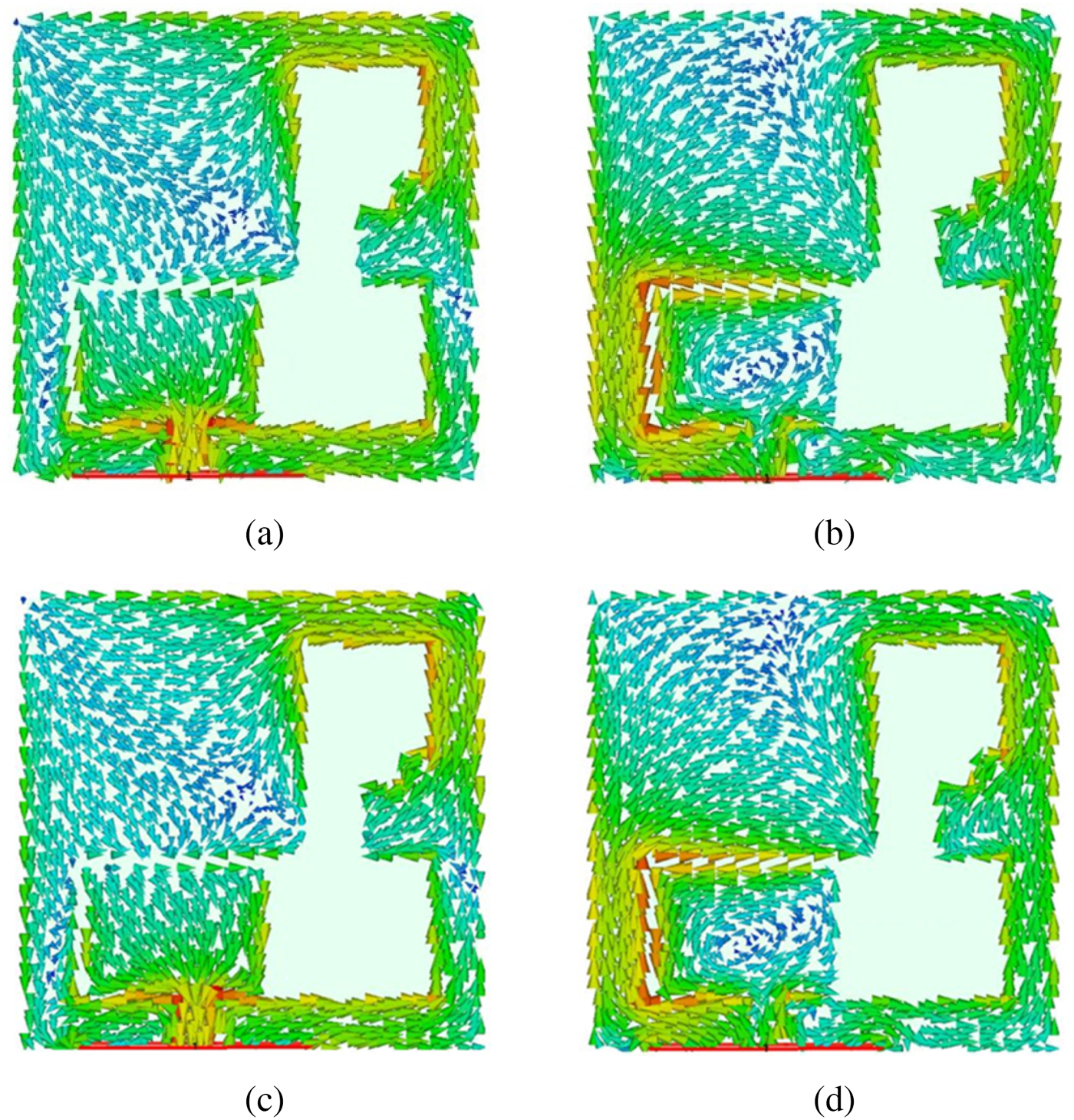 Fig. 7. Current distribution of the proposed antenna at 1.58 GHz: (a) ωt = 0°, (b) ωt = 90°, (c) ωt = 180°, (d) ωt = 270°.