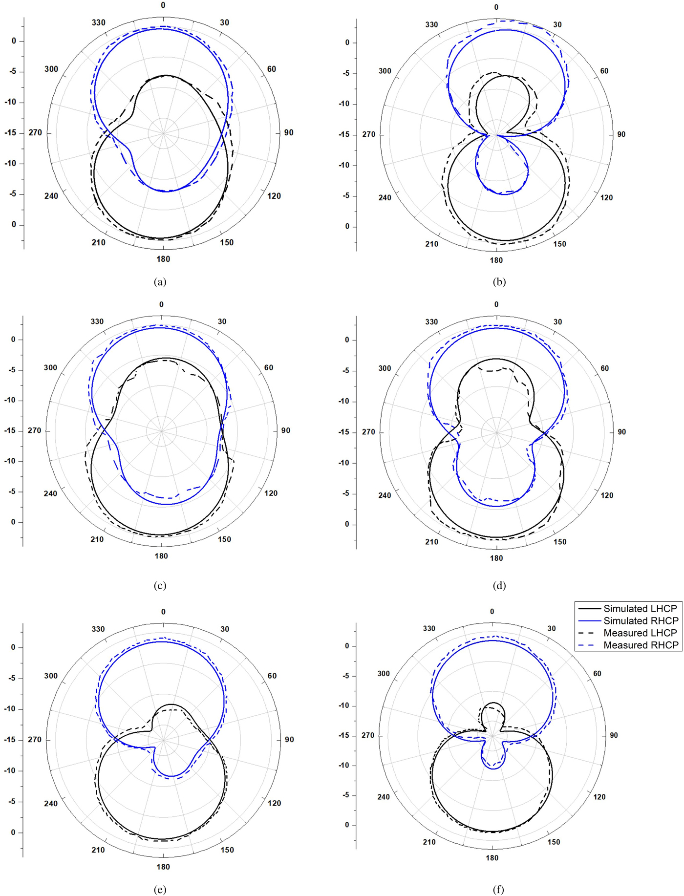 Fig. 8. Radiation pattern of the proposed antenna: (a) 1.17 GHz, XZ-plane; (b) 1.17 GHz, YZ-plane; (c) 1.22 GHz, XZ-plane; (d) 1.22 GHz, YZ-plane; (e) 1.58 GHz, XZ-plane; (f) 1.58 GHz, YZ-plane.