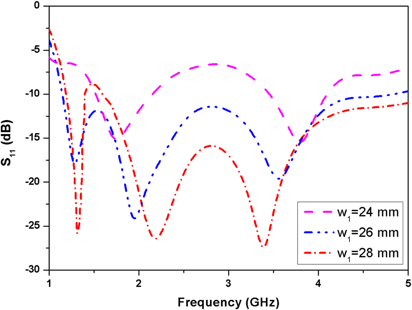 Fig. 9. Simulated S 11 with different values of w 1.