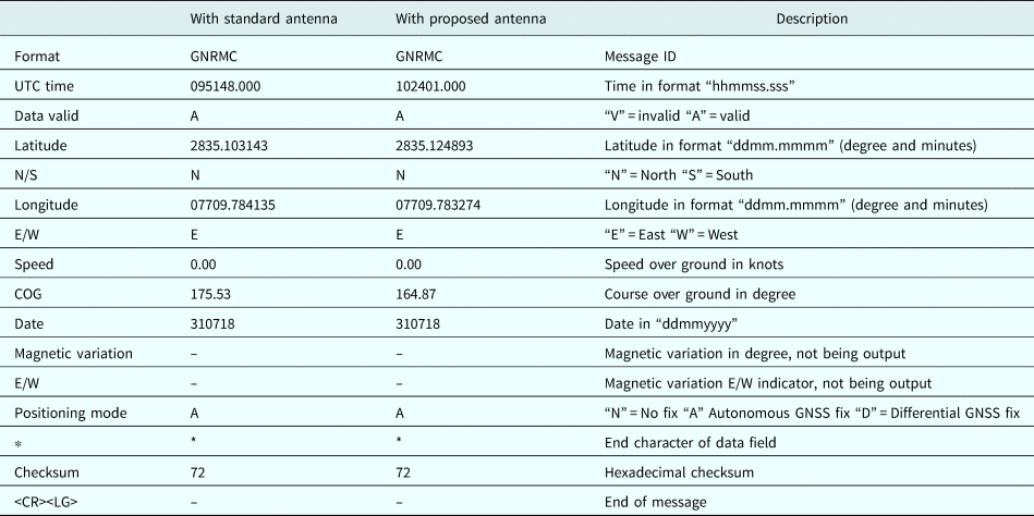 The first command used to open the GPS system is “AT + CGPSPWR = 1”. Further, the command “AT + CGPSSTATUS?” is used to locate the current status of the GPS. A GPS generates several responses in the form of a string; a few of the standard responses are “Location unknown” which means GPS is not running; “Location not fix”, it appears when GPS is running but the location is not fixed. The responses “Location 2D fix” and “Location 3D fix” illustrate the test environment that GPS is capable of receiving either 2D data or 3D-based location information. These commands need to be executed multiple times since the GPS requires some time to initialize and fix the status. Once the location of GPS is set, the data can be easily generated using the “AT + CGPSOUT = 32” command, as an output on the screen. The location-based data provided by GPS is in the National Marine Electronics Association (NMEA) format which is a standard data format supported and accepted by all GPS manufacturers globally. For the setup shown in Fig. 11, the location-based data were obtained and represented in the first (with standard antenna) and second (with proposed antenna) columns of Table 2.