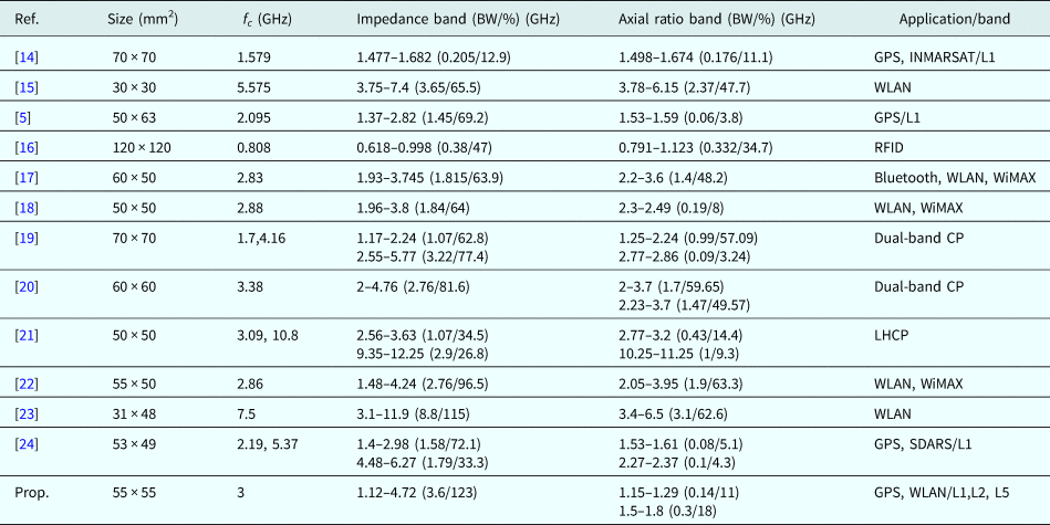 Table 3 compares various characteristics of the proposed antenna with the previously reported antenna structures based on CPW feed technique [Reference Wang and Hisao5, Reference Sze and Ou14Reference Zheng, Lai and Wang24]. The antennas proposed in [Reference Wang and Hisao5, Reference Sze and Ou14, Reference Zheng, Lai and Wang24] provide RHCP radiation and has a narrow axial ratio bandwidth suitable for GPS L1 band only; they do not cover other lower frequency bands (L2 and L5). The designs presented in [Reference Pouyanfar and Azarmanesh15Reference Zhai, Yang, Xi and Feng23] provide a wider axial ratio bandwidth and are suitable for WLAN, WiMAX, and RFID applications. Comparatively, the proposed CPW-fed antenna covers lower frequency bands and has the advantage of compact size, wide impedance, and axial ratio bandwidth. A broadband design is chosen in contrast to multiband antenna structure due to the fact that broadband antennas usually present better radiation pattern symmetry and higher polarization purity [Reference Li, Guo, Dai and Fu25], which improves the location accuracy of the antenna in L1, L2, and L5 satellite bands.