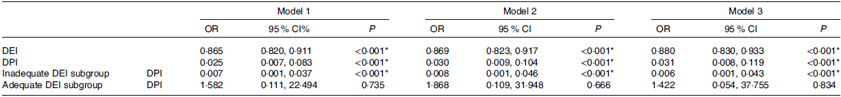After adjustment for eGFR, Hb, TLC, Alb and serum ferritin, multivariate logistic regression model showed that DEI was an independent factor of PEW (Table 2). For every 1 kcal/kg/d increase in DEI, the incidence of PEW decreased by 12·0 % (OR = 0·880, 95 % CI = 0·830, 0·933, P < 0·001). As for DPI, it was also significantly related to PEW, and the incidence of PEW reduced by 9·69 % for every 0·1 g/kg/d increase in DPI (OR = 0·031, 95 % CI = 0·008, 0·119, P < 0·001). However, the effect of DPI on PEW disappeared in the subgroup with adequate DEI (P > 0·05) and remained in the inadequate DEI subgroup (OR = 0·006, 95 % CI = 0·001, 0·043, P < 0·001).