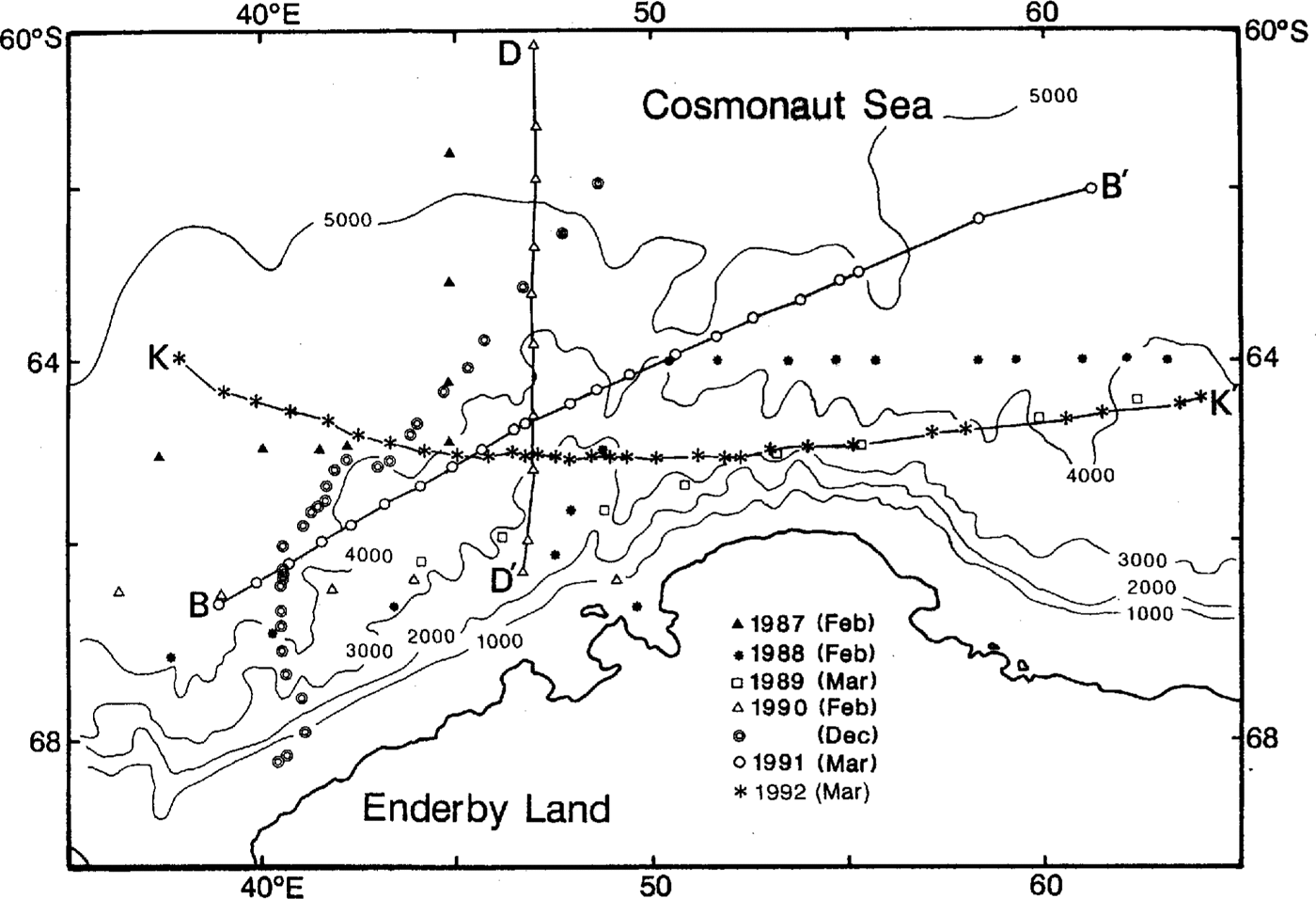 Figure 1 indicates locations of XBT stations during 1987–92 used in this study. The XBT observations were restricted to one transect each year, but two transects were obtained in 1990. Three sections D-Dʹ, in 1990, B-B' in 1991 and K-K' in 1992 in the figure were taken for the purpose of traversing the Cosmonaut Polynya area. The XBT observations along these sections were carried out at short intervals, so that we could see the detailed temperature structure. The cast-west temperature sections in March 1991 (B-B') and 1992 (K-K') arc illustrated in Figures 2 and 3, respectively. The Circumpolar Deep Water (CDW) with a temperature higher than l.0°C is found between about 150 and 1000m depth except at 45-50° E. The north-south temperature section in February 1990 is shown in Figure 4. The CDW is seen in the north of the Section, and cold water with a temperature below –1.5°C is located at a depth of about 100–400 m around 66° S. This cold water is the Winter Water (WW) formed by cooling during winter. The shallowing of the 1.0°C isopleth at about 63° S suggests the upwelling of CDW. Figures 2–4 show typical examples and the other sections which are not presented here indicate a similar structure.