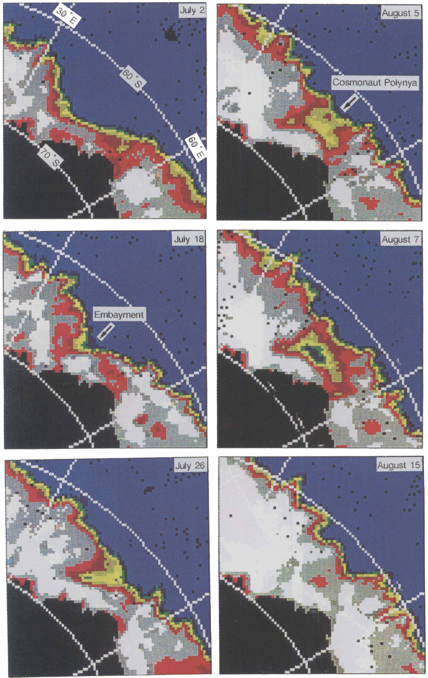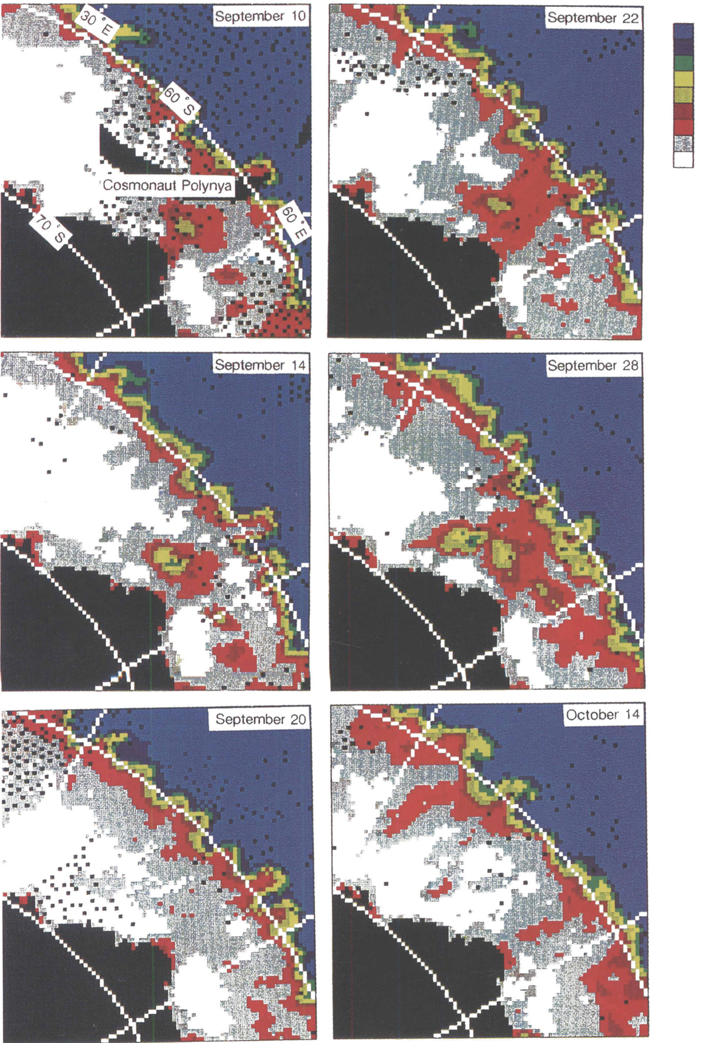 The SSM/I data used in this study were the DMSP SSM/I sea-ice concentration grids generated using the NASA Team algorithm provided by the National Snow and Ice Data Center, University of Colorado, Boulder, Colorado. We prepared a data set of ice-concentration maps during 1987 to 1991 of the sector 0–90° E in the Southern Ocean using image-processing software SSMIICE. The series of images reveals the occurrence of Cosmonaut Polynya. Figure 8 shows a sequence of images for 2 Ju1y-14 October 1988. A low ice-concentration embayment started to form at about 65° S, 45° E on 18 July. The pack-ice with a concentration of 61–80% enclosed it and Cosmonaut Polynya was completed on 7 August. After that, the polynya rapidly shrank and it became indeterminate on 15 August. This evolution is similar to that in 1980 demonstrated by Reference Comiso and GordonComiso and Gordon (1987). In 1980, Cosmonaut Polynya did not recur during the rest of the winter. In 1988, however, a large low ice-concentration area appeared on 10 September, but its location shifted somewhat to the east from the previous observation. It disappeared on 20 September hut appeared again on 22 September. The second stage of Cosmonaut Polynya persisted for a month until about 10 October. The minimum ice concentration for the totally enclosed polynya for the year was 15–30% on 7 August and 28 September.