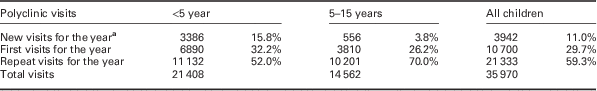 Table 4 shows the number of repeat visits to the polyclinics in 2012. Overall, 11% of children who visited any one of the polyclinics during the given year were new patients who had never visited the polyclinics in the past and 89% of visits were by children who have had previous visits to that facility (first visit and repeat visits for the year). An overall 59% of the children who visited the facility during 2012 have had one or more previous visits (repeat visits) during 2012. An overall 15.8% of the children younger than five years who visited the polyclinics were new and 3.8% of children aged five or more were new patients.
