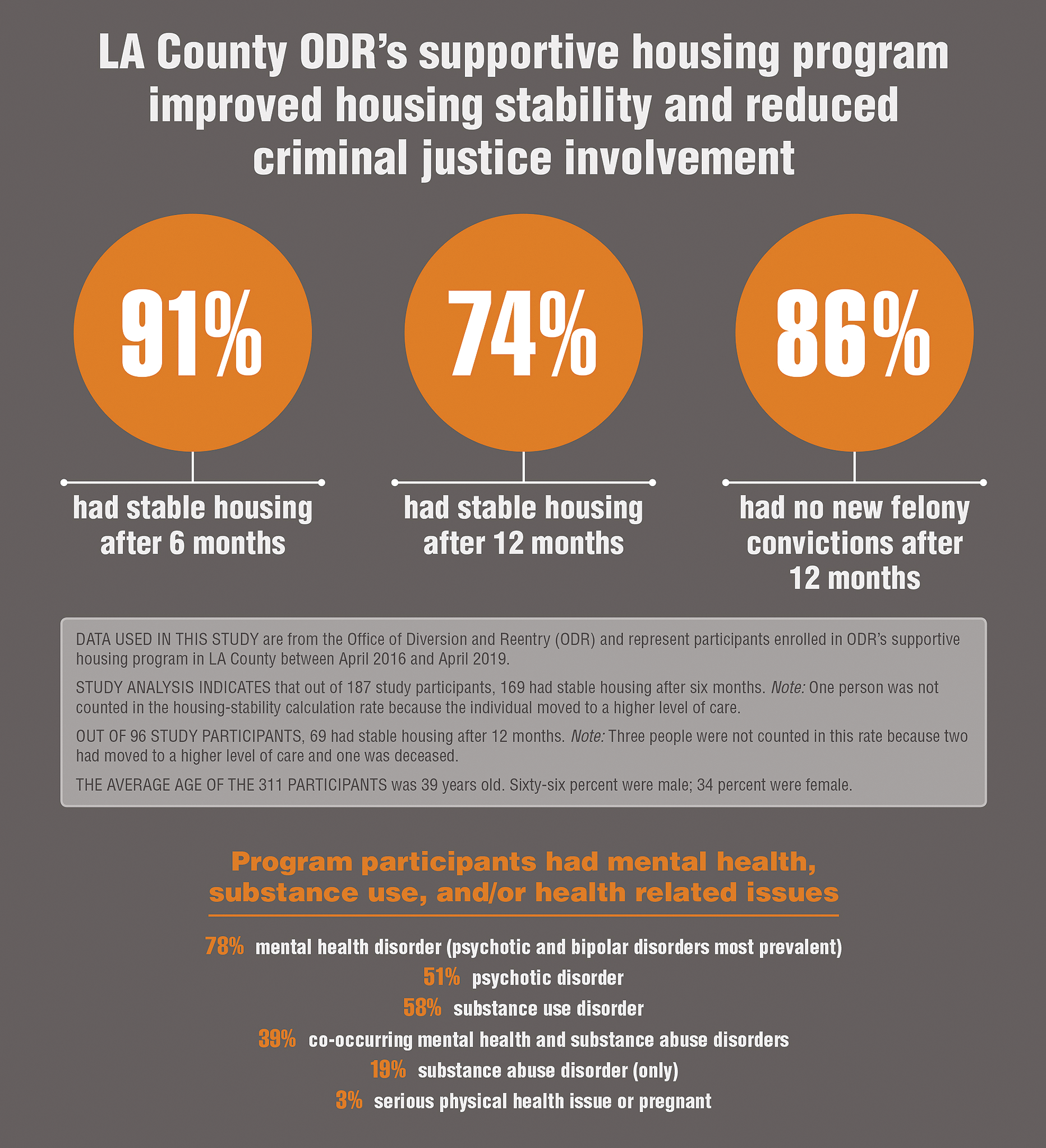 The ODR Housing program provides permanent supportive housing to individuals who are homeless, have a serious mental health disorder, and who are incarcerated in the Los Angeles County Jail. This program, offered in partnership with the Los Angeles County Superior Court, is available to pretrial defendants who have criminal felony cases. ODR Housing attempts to resolve these felony cases early and divert defendants through a grant of probation. Clients in the ODR Housing program are assigned an Intensive Case Management Services (ICMS) provider who works with the client as they transition from custody to community. ICMS providers serve as the core point of contact for supportive services including medical and mental health treatment. See Figure 2 for preliminary data on permanent supportive housing.
