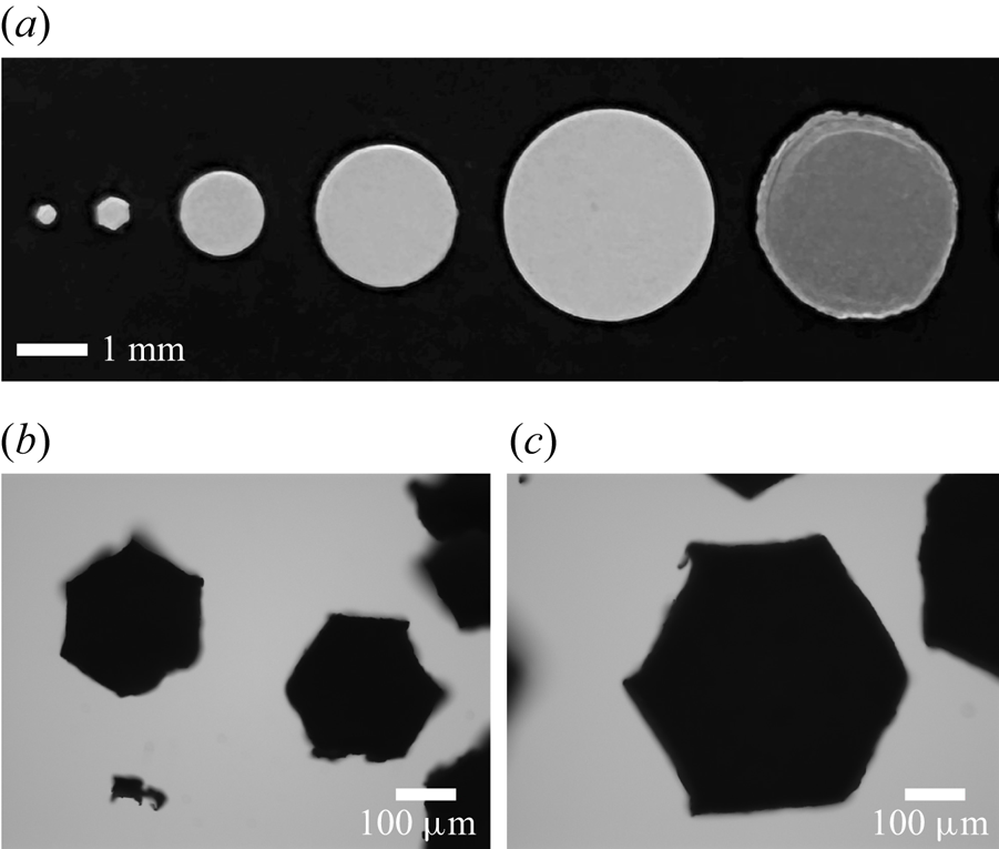 $100\,\mathrm {\mu }$m sheets of PET. The 0.3 and 0.5 mm disks are hexagonal in shape (see figures 1b,c), and we take