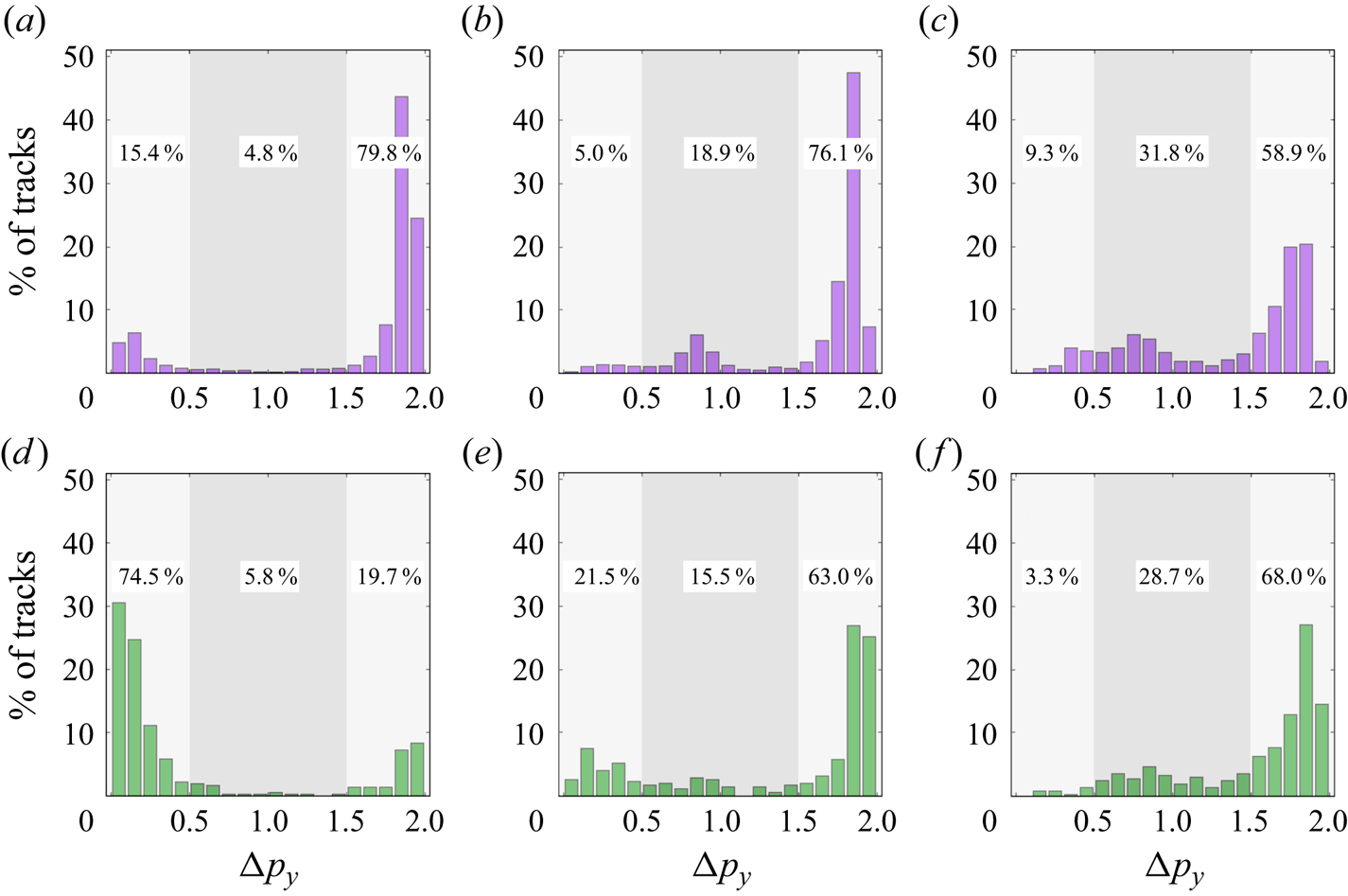 $1.5 \leq \Delta p_y \leq 2$, respectively (Tinklenberg et al. Reference Tinklenberg, Guala and Coletti2023). The labelling is nominal, and the exact definitions do not alter the conclusions. In quiescent air, the distributions are bimodal for both considered disk sizes, with a prevalence of either tumbling (