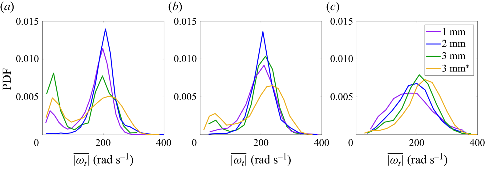 $|\omega _t|$, averaged along each trajectory and plotted in figure 12, illustrate the trends with varying turbulence intensity and disk properties. In still air (figure 12a), the bimodal PDFs reflect that seen above for the angular excursion. Visual observation confirms that trajectories with