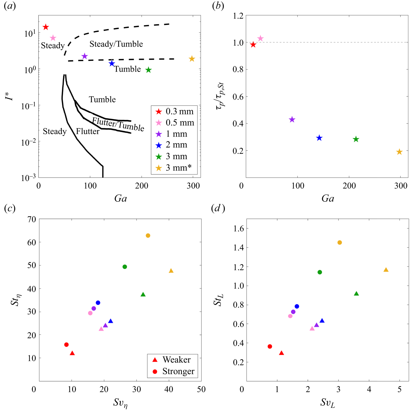 The above trends for the angular velocity have been shown by using dimensional units. Appropriate non-dimensionalization of this quantity is not trivial, as it requires identifying the characteristic time scale of rotation. Theoretical estimates are available only in the Stokesian drag limit, outside of which it is usually determined experimentally (Kramel Reference Kramel2017; Gustavsson et al. Reference Gustavsson, Sheikh, Naso, Pumir and Mehlig2021; Roy et al. Reference Roy, Kramel, Menon, Voth and Koch2023). In Tinklenberg et al. (Reference Tinklenberg, Guala and Coletti2023), we proposed that the rotation time scale of inertial disks in quiescent air be set by the response time