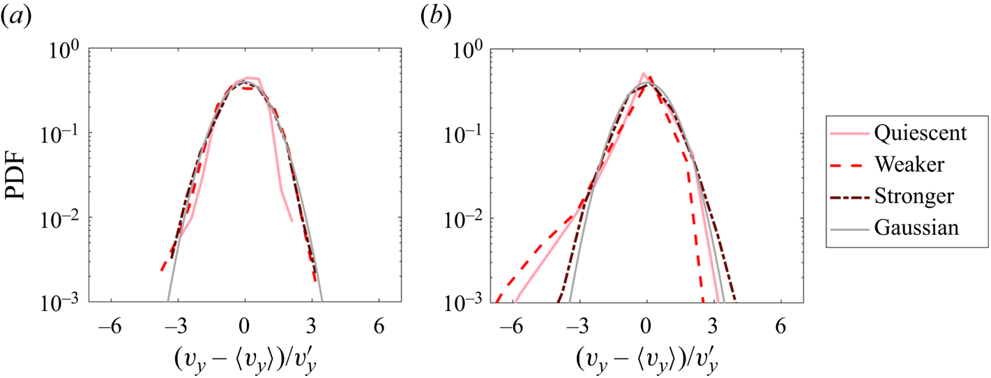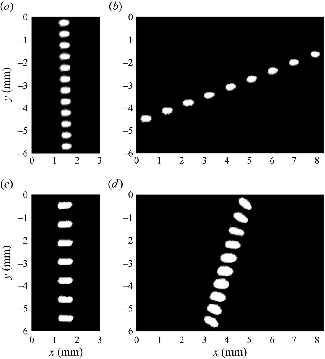 $\mathcal {R}$ as discussed in § 3.1. Stronger turbulence, however, produces increasingly flatter distributions. This intuitive trend is consistent with the numerical and theoretical findings of Anand et al. (Reference Anand, Ray and Subramanian2020). Their model too, however, assumed Stokesian drag, therefore any comparison can be only qualitative. We note, in particular, that the observed randomization of the orientation is much more pronounced than in their simulations: in the stronger turbulence, the broadside-on orientation is only approximately three times more frequent than the edge-on orientation. This behaviour is also likely to magnify the effect of the lateral cross-flow, as more tilted disks offer a larger effective area to the horizontal turbulent fluctuations.