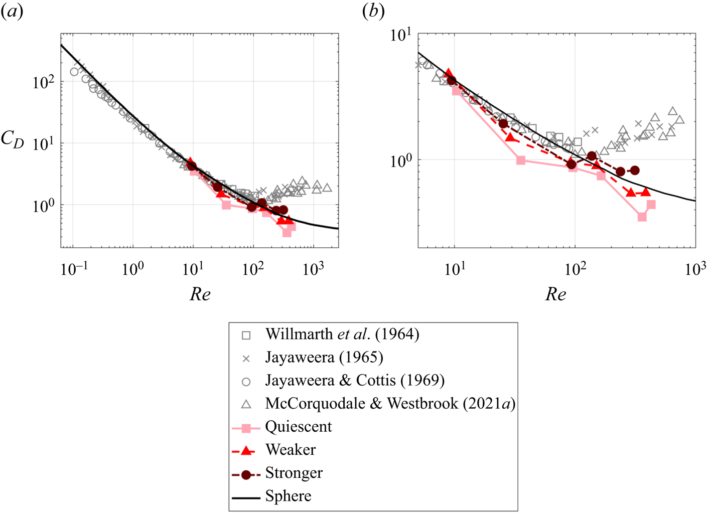 $Re \gg 1$, the nonlinear relation between the drag force and the particle–fluid slip velocity implies that the settling is hindered by upward fluctuations more than enhanced by downward ones. This can cause a net reduction of settling velocity for heavy particles (Tunstall & Houghton Reference Tunstall and Houghton1968; Mei, Adrian & Hanratty Reference Mei, Adrian and Hanratty1991; Wang & Maxey Reference Wang and Maxey1993; Bagchi & Balachandar Reference Bagchi and Balachandar2003; Homann, Bec & Grauer Reference Homann, Bec and Grauer2013; Good et al. Reference Good, Ireland, Bewley, Bodenschatz, Collins and Warhaft2014; Fornari et al. Reference Fornari, Picano, Sardina and Brandt2016b; Chouippe & Uhlmann Reference Chouippe and Uhlmann2019; Singh, Pardyjak & Garrett Reference Singh, Pardyjak and Garrett2023) as well as a reduction of rise velocity for bubbles (Ruth et al. Reference Ruth, Vernet, Perrard and Deike2021).