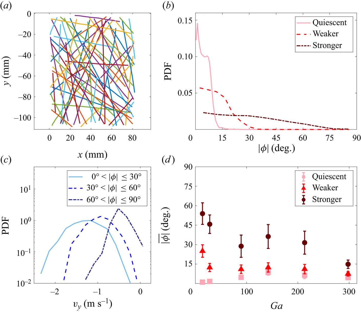 The above indicates that ambient turbulence alters the disk falling style, shifting it away from steady falling and increasingly towards tumbling. This is visible from the recordings and confirmed by analysing the change in orientation along each trajectory. In figure 11, we plot, again for
