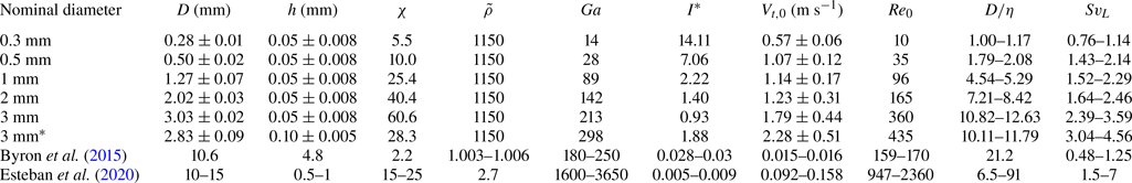 $^{-3}$) with dimensions listed in table 1, where important dimensional and non-dimensional parameters are summarized. The approximate nominal diameter will be used in the labelling of the following figures. The actual diameter is evaluated via standard or microscope imaging depending on the disk size, while the thickness is obtained by caliper measurements as described in Tinklenberg et al. (Reference Tinklenberg, Guala and Coletti2023). Most considered disks are commercially manufactured glitter of thickness