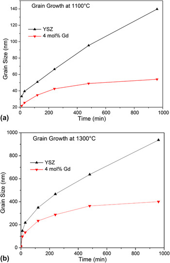 FIG. 4. Grain growth behavior of YSZ and 4 mol% Gd doped YSZ at (a) 1100 °C (b) 1300 °C. Plateau is observed in both temperatures for Gd-doped samples, in contrast to Gd free YSZ.