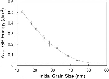 ), a plateau is observed after 50 nm, where the GB energy should not significantly change and has achieved a minimum. While this is already evidence of the existence of the quasi-zero GB energy state, this is still an average energy value. To calculate the absolute (at a given temperature and grain size) GB energies for each initial grain size, one may use the fact that for larger grains, the difference between
