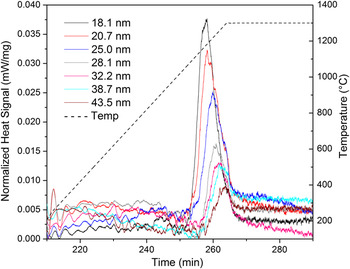 To measure the respective GB energies, each sample was subjected to DSC to provoke grain growth and quantify the released heat. Figure 2 shows the DSC heat signals for all samples. Characteristic exothermic peaks starting at about 1000 °C are observed for all samples and were attributed to grain growth. Reference Dey, Chang, Gong, Liu and Castro20,Reference Quach and Castro22 Thermogravimetric analyses using the same conditions showed no mass evolution at the studied temperature range, suggesting no parallel redox or decomposition reactions that could show heat effects in the DSC. Table 1S lists the grain sizes for the samples before and after the DSC peak measured using XRD whole profile fitting and SEM—larger samples were only tested with SEM since XRD peak fitting becomes unreliable for grains >100 nm. No grain growth was observed up to the start of the DSC peak, so the grain sizes for the samples before the peaks are similar to those of the as-prepared pellets. However, after the DSC peak, the grain sizes range from 252 to 312 nm, signifying very small GB areas. This demonstrates that the exothermic DSC peaks are indeed attributed to grain growth.
