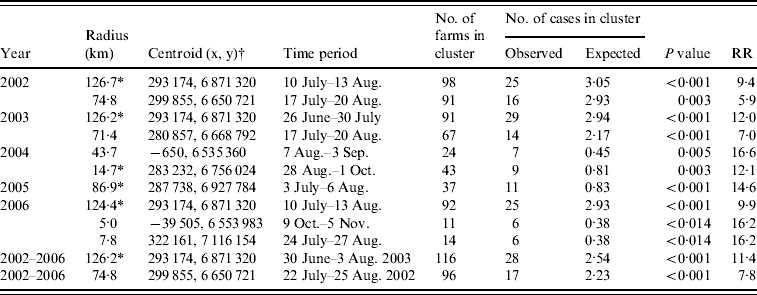 Table 1. Statistically significant clusters (P⩽0·05) for Campylobacter spp.-positive broiler flocks calculated by space–time scan statistics