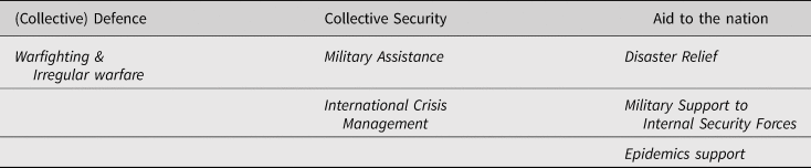 Yet, what exactly do we mean when we talk about roles, tasks, and missions? In spite of their widespread usage, there is rarely consensus on what they mean. Starting from a basic understanding of roles as socially constructed, we draw on Paul Shemella's work and define role as ‘a broad and enduring purpose’, whereas tasks or missions are actions to be taken, which might change over time within the remits of one role.Footnote 9 Hence, whereas the military's engagement in peacekeeping might be considered a role, contribution with peacekeeping troops to the UN mission in Mali is a task. The two categories are thus distinct, yet their relationship is complex, as some tasks or missions can transform into roles over time, sometimes through novel legislation.Footnote 10 The military's domestic counter terrorism tasks have, for example, been transformed to roles in some states, where they have taken on a broad and enduring character. These definitions are the starting point for our study, yet we unwrap the discussion on their complex interrelations further on in the article.