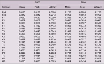 Because of the great temporal resolution that characterizes them, electroencephalographic (EEG) signals have been often analyzed to gain insights into the brain processes which are carried out during language processing tasks. In more detail, investigations on language processing have been performed considering event-related potentials (ERPs) since the early 1980s (Kutas & Hillyard, Reference Kutas and Hillyard1980; Kutas & Federmeier, Reference Kutas and Federmeier2000; Bambini, Reference Bambini, Östman & and Verschueren2012). ERPs are voltage changes of the electrical activity of the brain and can be induced by sensory or cognitive events (Luck & Kappenman, Reference Luck and Kappenman2011). Two ERP signatures, N400 and P600, have been found to strongly interact with the brain response to linguistic inputs. Specifically, N400 is a negative component peaking between 300 and 500 ms after stimulus onset, and its elicitation has been associated with difficulties in lexical–semantic retrieval (Kutas & Federmeier, Reference Kutas and Federmeier2000; Lau et al., Reference Lau, Phillips and Poeppel2008), semantic integration/unification mechanisms (Hagoort & van Berkum, Reference Hagoort and van Berkum2007), the processing of more or less expected information structural patterns (Cowles et al., Reference Cowles, Kluender, Kutas and Polinsky2007; Wang & Schumacher, Reference Wang and Schumacher2013; Masia et al., Reference Masia, Canal, Ricci, Lombardi Vallauri and Bambini2017), and the decoding of non-literal meanings (Kutas & Federmeier, Reference Kutas and Federmeier2011; Weiland et al., Reference Weiland, Bambini and Schumacher2014). P600, a component peaking between 500 and 800 ms, was originally observed in parsing difficulties caused by syntactic violations or garden path sentences (Osterhout & Holcomb, Reference Osterhout and Holcomb1992; Hagoort et al., Reference Hagoort, Brown and Groothusen1993; Kaan & Swaab, Reference Kaan and Swaab2003), yet its functional role has also been associated with mechanisms of context update (Burkhardt, Reference Burkhardt2006; Hoeks et al., Reference Hoeks, Brouwer, Holtgraves and Holtgraves2014) and new information decoding (Burkhardt, Reference Burkhardt2007; Domaneschi et al., Reference Domaneschi, Canal, Masia, Lombardi Vallauri and Bambini2018).
