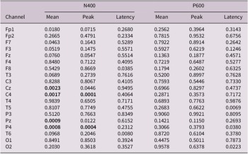 It is worth specifying that, since the number of electrodes employed for our EEG acquisitions is quite limited, in the statistical tests performed we opted to rely on the Bonferroni correction to handle the family-wise error rate (FWER) in our multiple-comparison scenario, instead of resorting to non-parametric statistical tests such as Threshold-Free Cluster Enhancement (TFCE) analysis (Smith & Nichols, Reference Smith and Nichols2009), which could benefit from high-density montages to improve the computed statistics. Actually, we found significant effects even following the parametric testing approach, which is typically much more conservative than non-parametric alternatives.