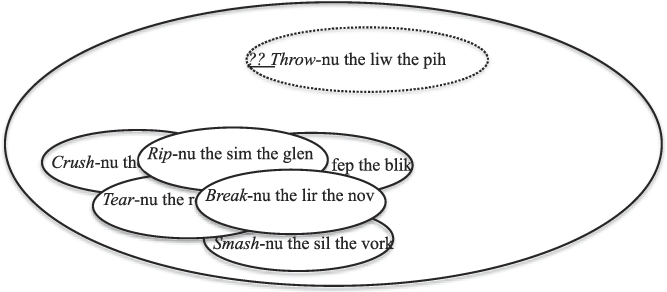 Categorization, as captured by the notion of coverage, thus allows for the fact that language is often productive within a circumscribed semantic, pragmatic, and phonological space. That is, coverage captures the idea that new uses of verbs must fit, or be able to accommodate, the semantic, pragmatic, and phonological constraints of the constructions they appear in (Ambridge et al., Reference Ambridge, Pine, Rowland, Jones and Clark2009; Coppock, Reference Coppock2008; Goldberg, Reference Goldberg1995; Gropen et al., Reference Gropen, Pinker, Hollander, Goldberg and Wilson1989; Gropen, et al., Reference Gropen, Pinker, Hollander and Goldberg1991; Pinker, Reference Pinker1989). Since speakers implicitly categorize instances of each construction, and thereby form generalizations about semantic, pragmatic, and phonological constraints, new expressions are judged to be well-formed to the extent that they satisfy the general constraints of the constructions involved.